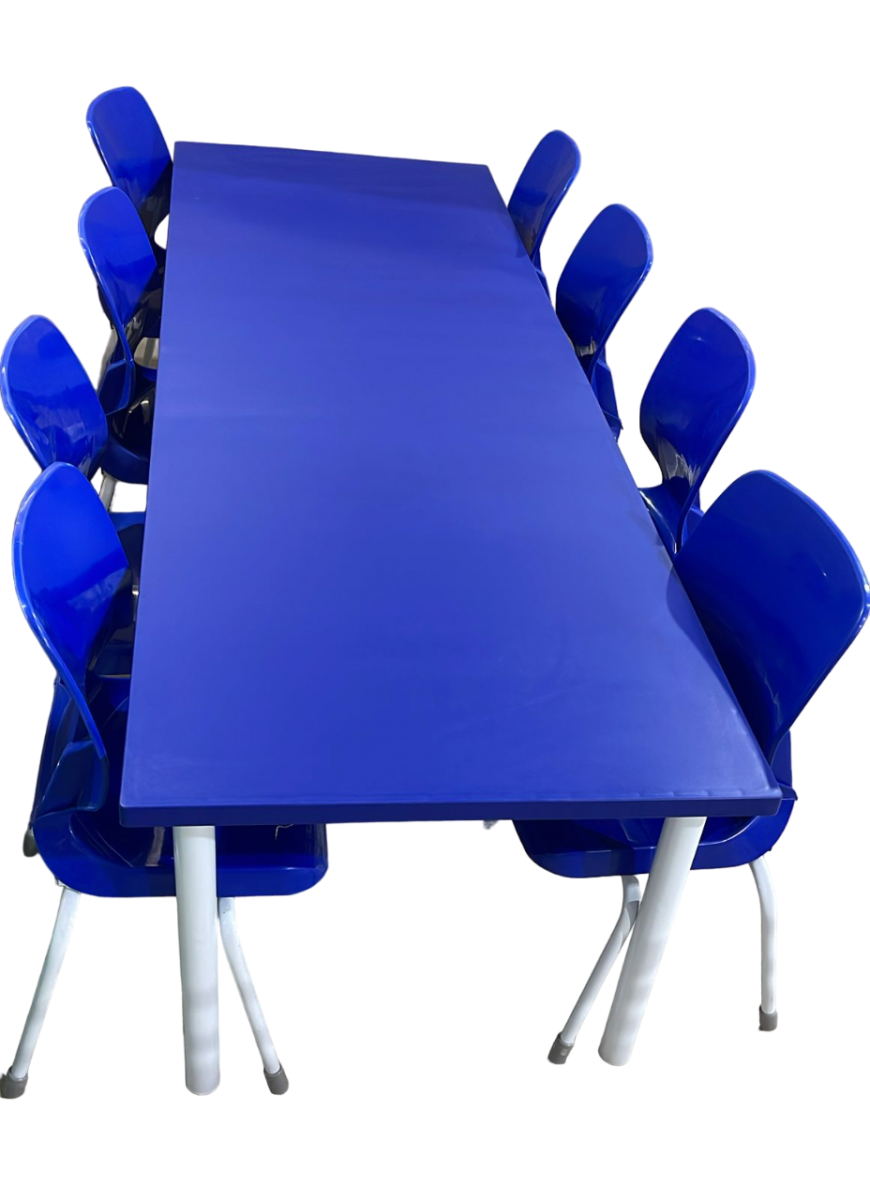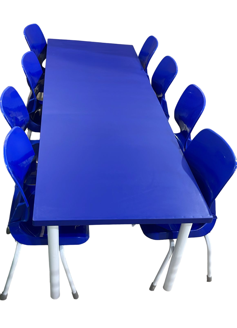 Mesas e cadeiras para tamanhos infantil, juvenil e adulto. Mesas com medidas variadas com opções de 4 cadeiras a 12 cadeiras por conjunto.